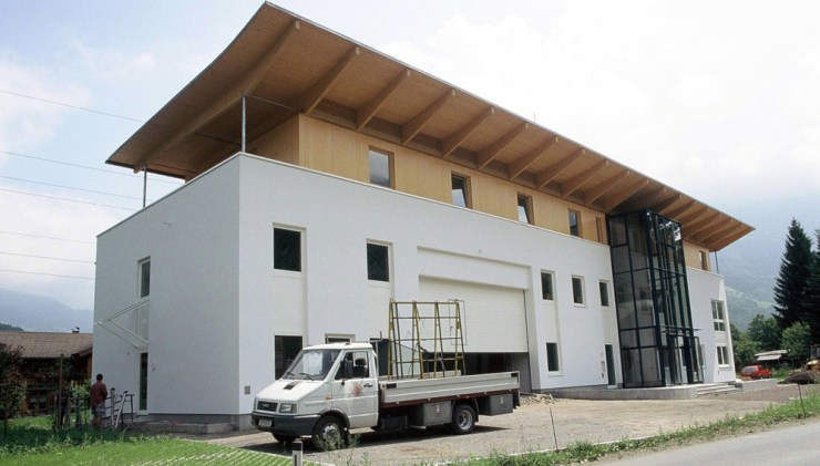 Die Grundidee des Entwurfes ist eine klare Funktionstrennung zwischen der Verwaltung und den Betriebsräumlichkeiten des Forstes. Der mit einer großzügigen Verglasung klar situierte Eingang kann ohne Umwege und ohne Störung des Betriebes erreicht werden. Der Foyerbereich erstreckt sich über die ganze Gebäudetiefe und erlaubt durch die freie, vor die Fassade springende Stiegenkonstruktion interessante Blickverbindungen nach außen. Die Wahl der Dachform mit der charakteristischen „Wimper“ zur Hauptfassade erklärt sich aus der geringen Konstruktionshöhe. Diese führt zu einer vertretbaren Schatteneinwirkung auf das Nachbargrundstück.