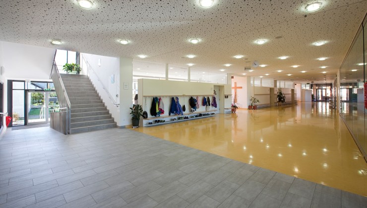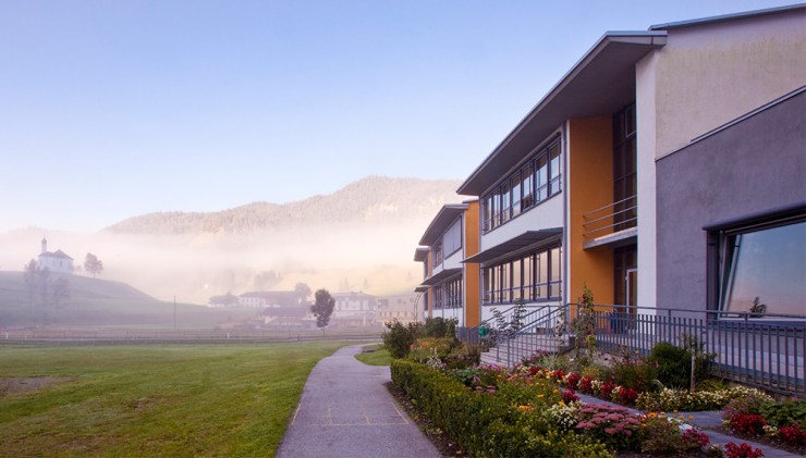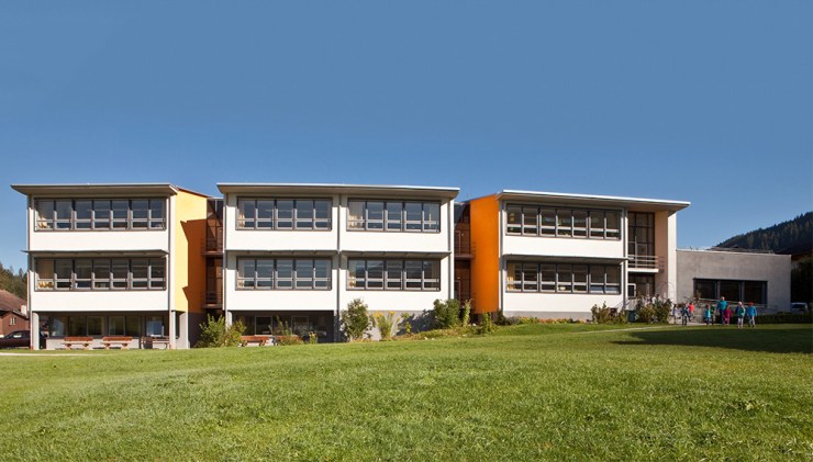 Die 3-geschossige Schule ist durch einen nördlichen Längsbau, eine Turnhalle im Osten und 8-Stammklassen im Süden gegliedert. Im Zwischenraum liegt der zentrale Foyerbereich – das Herzstück des Gebäudes. Sämtliche Klassen und Funktionsräume sind im EG & OG an diese leicht geschwungenen Plätze angeordnet. Eine gute Übersicht und eine leichte Orientierung sind somit gegeben. Über Gebäudeeinschnitte, die zwischen den Klassen angeordnet sind, wird Tageslicht in den Innenbereich gelenkt. Diese Einschnitte strukturieren den Baukörper und sorgen für eine maßstäbliche Einordnung des Baukörpers in die größtenteils kleinteilige Bebauungsstruktur der Gemeinde Achenkirch.