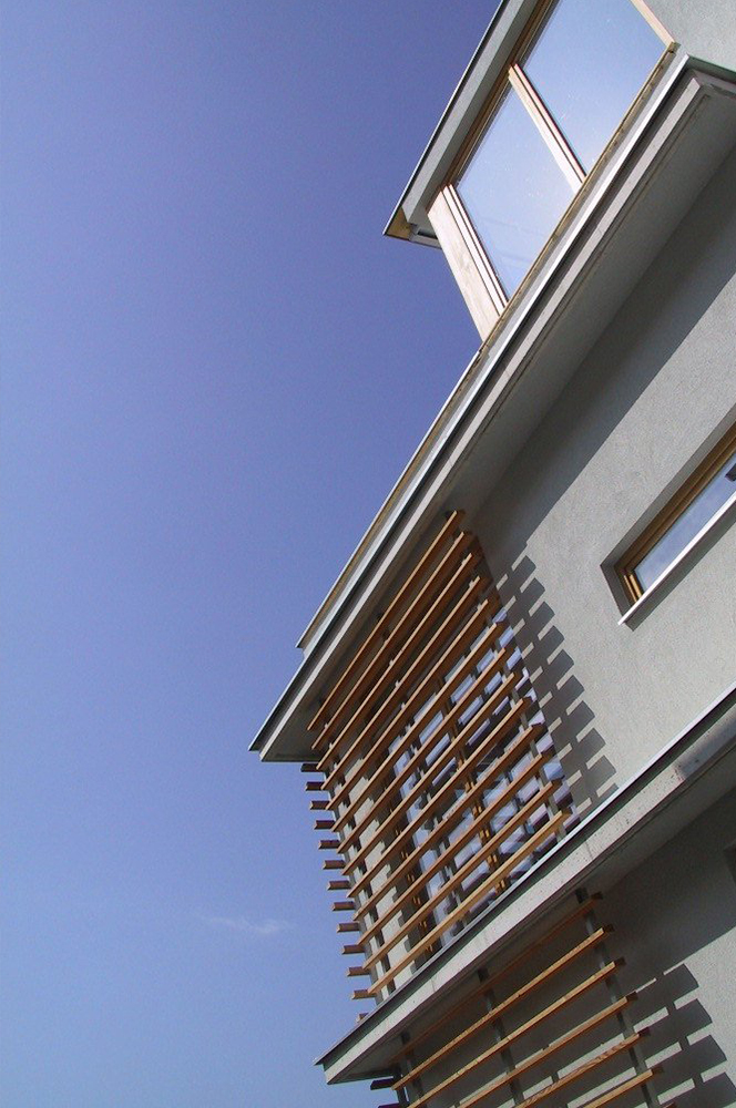 Das Gebäude ist in 2 übereinanderliegende Einheiten geteilt. Der oberen Wohnung ist eine luftige Dachterrasse zugeordnet, die erdgeschossig erschlossene Wohnung ist an den Garten angegliedert. Der Eingangs-bereich an der Hans-Sachs-Gasse liegt etwas über dem Gartenniveau. Als Antwort auf diesen Höhensprung wurden die Geschossebenen in der Gebäudequerachse halbgeschossig versetzt. Durch die Ausbildung von offenen Innenstiegen und 2-geschossigen Raumbereichen fließen die Räume ineinander. Zum Obstgarten sind großzügige Verglasungen mit vorgeschalteten Holzlamellen angeordnet, zur Straße ist die weiße Putzfassade mit Fensterbändern gestaltet.